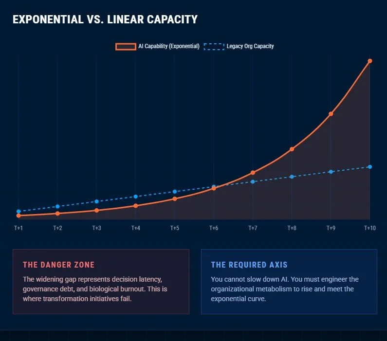 The velocity gap is widening. Most enterprises are attempting to deploy supersonic technology on top of rigid, legacy governance models. The result is The Metabolic Mismatch - a systemic failure where decision latency, governance debt, and biological burnout destroy transformation before it begins.